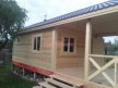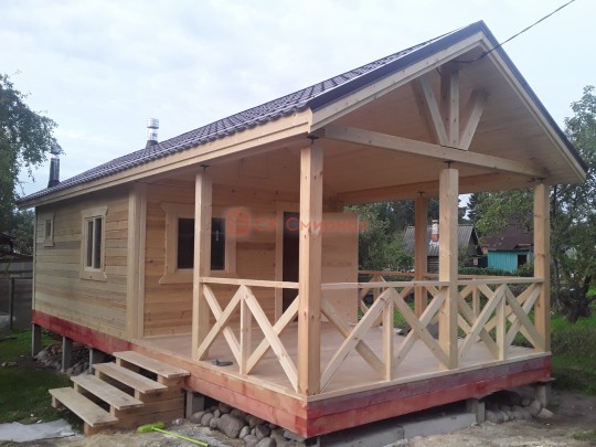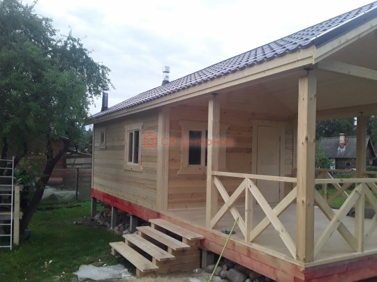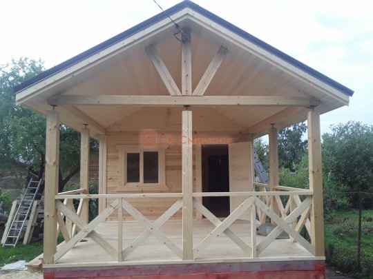 Обратите внимание на столбы, установленные на террасе: они закреплены на домкраты. Это делается для того, чтобы после усадки (а она будет даже при стройке из сухого бруса) можно было выставить нужный уровень. Это предотвратит перекосы крыши — всё продумано.