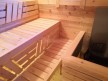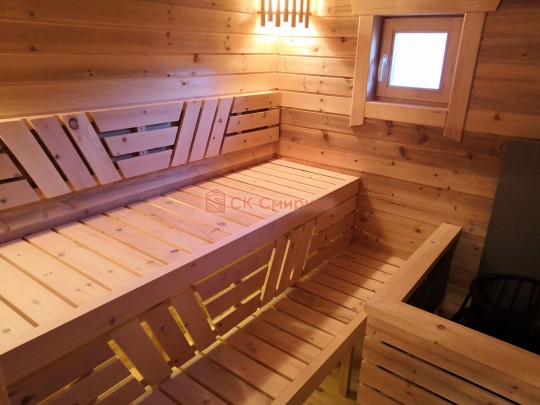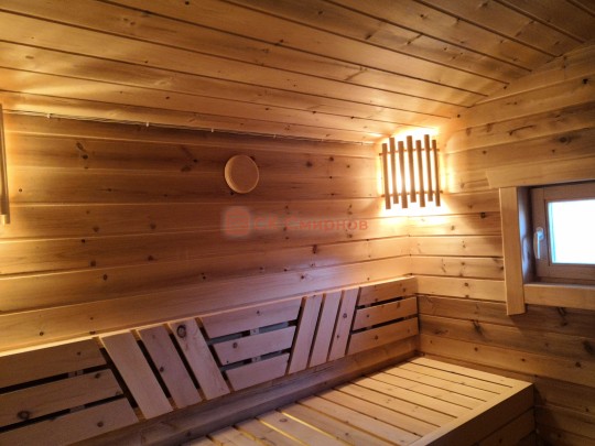 Кедровая вагонка в парной, спинки над пологами и декоративная решётка между пологами. Дверь крашеный усиленный стеклопакет (снаружи RAL 8017, изнутри «Жёлтый»);