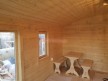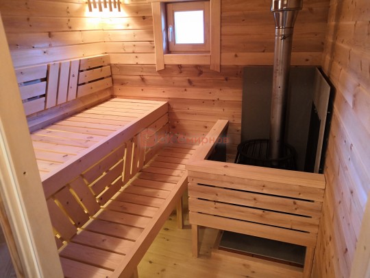 В комплект бани входит стол и две скамейки из доски 19мм, как на фото. Есть комплекты из более толстой доски а также из кедра, смотрите в доп комплектации.