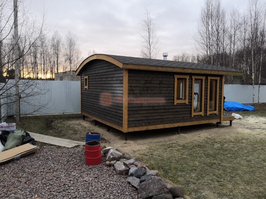 Для строительства этой красивой каркасной бани 5х6 метров СК Смирнов разработал авторский проект №217 с обустроенной парной из алтайского кедра и комнатой отдыха. По планировке общая площадь составляет 32 квадратных метра — есть сауна и просторная жилая комната с впечатляющими панорамными окнами во всю стену.