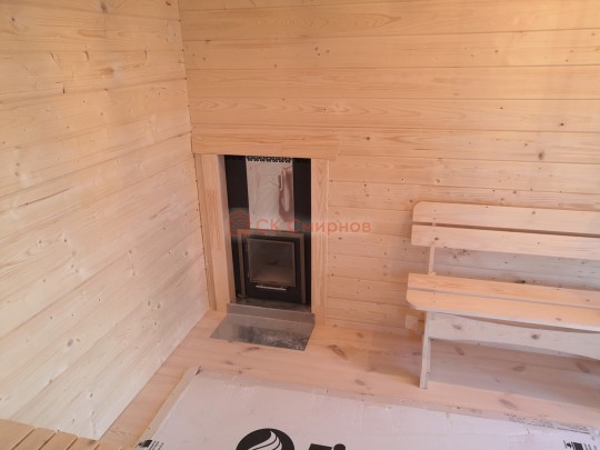 Установка печи Теплодар Русь сетка 12 л панорама ( со стеклянной дверцей ), трубы сэндвич, проходы и зонт входят в стоимость бани. Экран металлический через стену. На полу кладется кирпич, базальтовый картон, минерит. На стенах базальтовый картон, минерит, через втулки прикручивается минерит. Ссылка на сайт производителя https://www.teplodar.ru/catalog/detail/rus_setka_12_l_panorama/