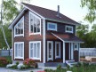 На фото представлен проект загородного дома №145 габаритами 6х7.5 метров и отличной планировкой общей площадью 76.5 квадратных метров. Можно выделить несколько особенностей проекта: панорамные окна. Объект полутораэтажный, может использоваться как дачный.