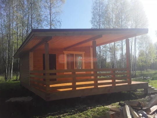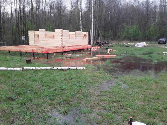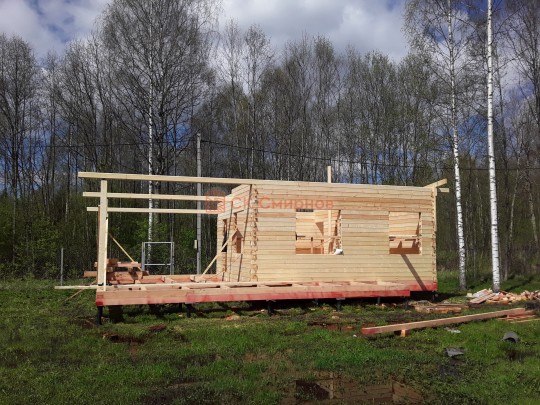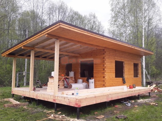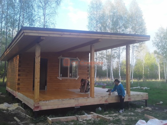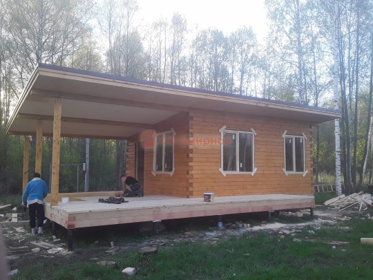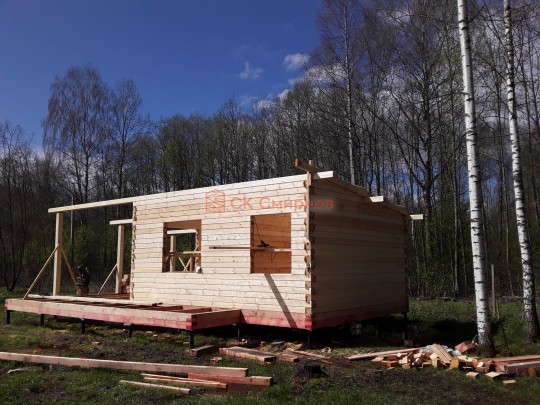 Из профилированного сухого бруса 9х14см, 14х14 см или 14х19 см. Сборка сруба в теплый угол на нагеля или гвозди 200 мм со сверлением отверстия в верхнем брусе (в зависимости от вида бруса).