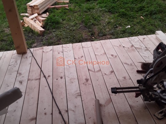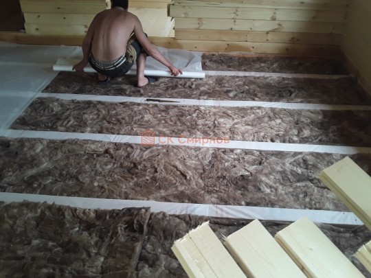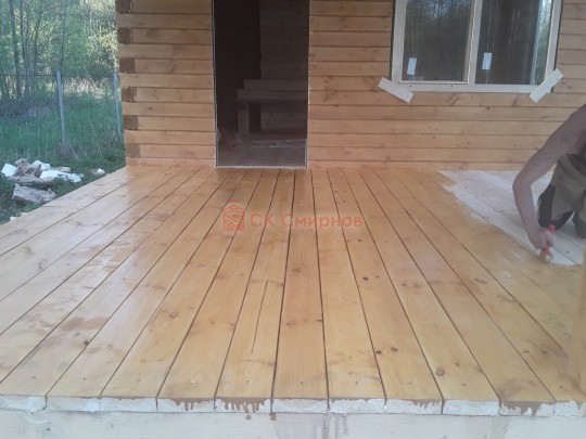 Лаги, обвязку и черновой пол обрабатываем раствором био огне защитой ( зимой оговариваются отдельные условия ), в основном красный цвет, но может быть и бесцветная обработка.
